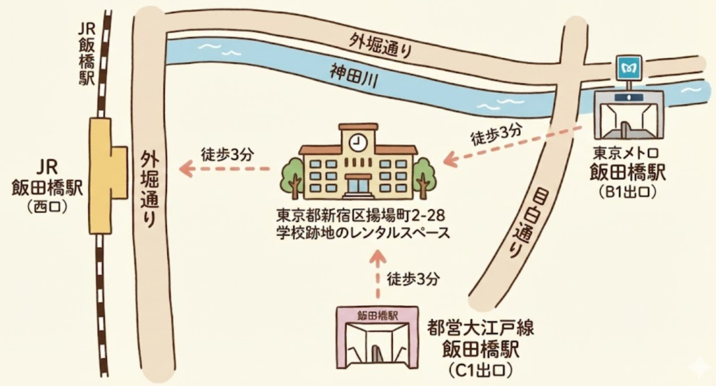 飯田橋は、JR、地下鉄各線が乗り入れ、都内主要駅からのアクセスも抜群。ビジネス街でありながら、歴史と文化が息づく魅力的なエリアです。そんな飯田橋で100名規模のセミナーを成功させるなら、学校跡地のレンタルスペースが断然おすすめです。